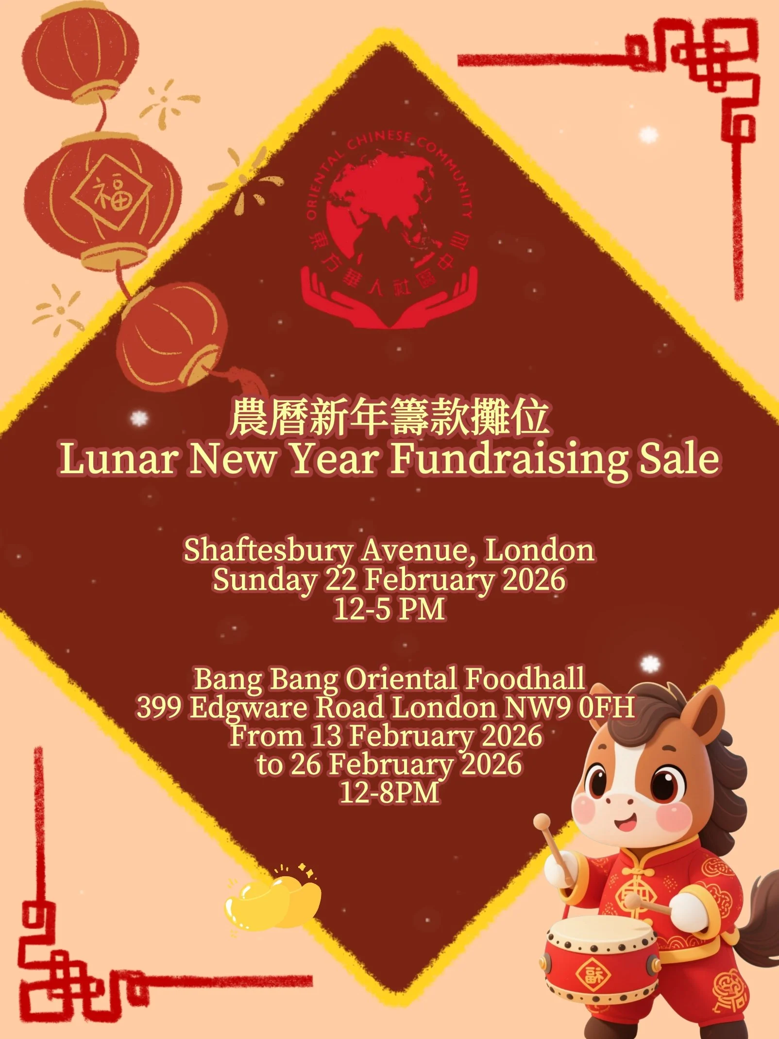 Lunar New Year Fundraising Sale Friday 13 February 2026 12:00 Thursday 26 February 2026 20:00 Google Calendar ICS
